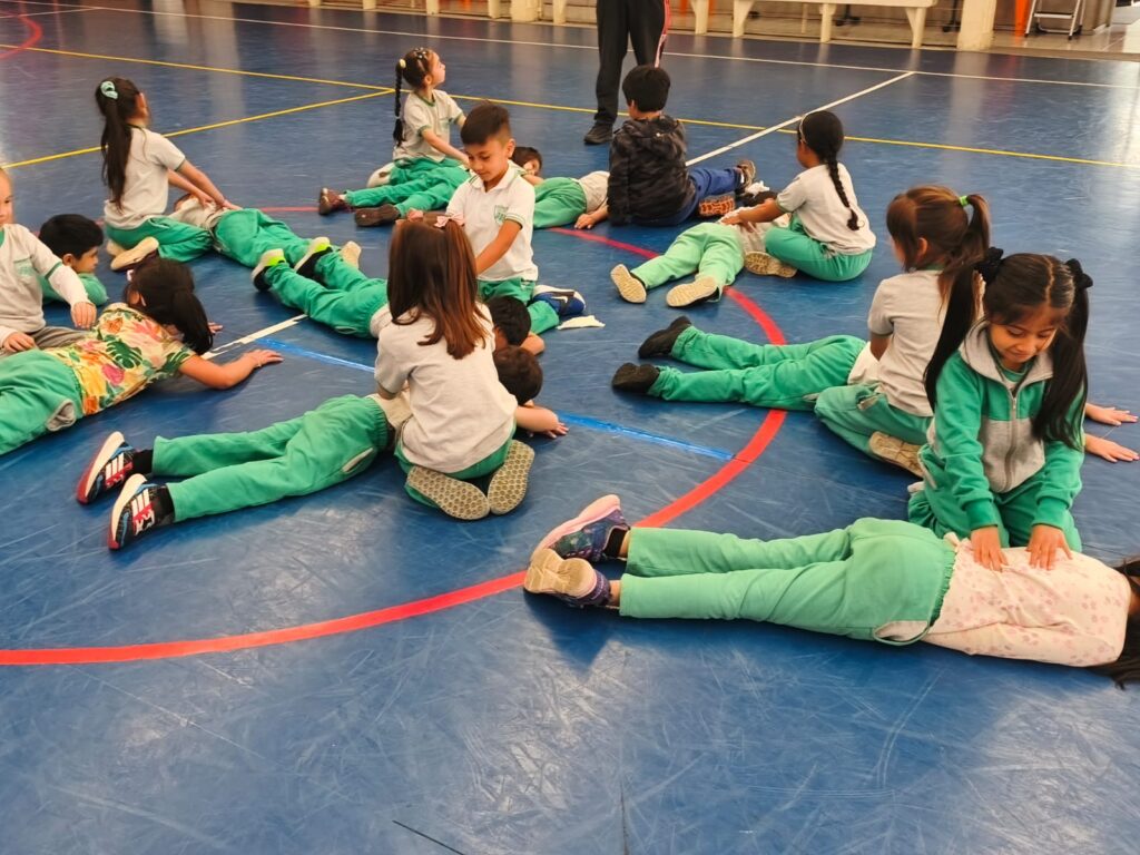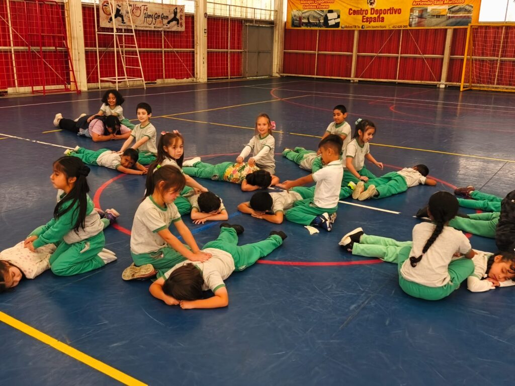 A través de una entretenida y relajante sesión en parejas, y guiados por su profesora, los niños y niñas exploraron sencillas técnicas de masaje, promoviendo el respeto, la confianza y el cuidado mutuo.