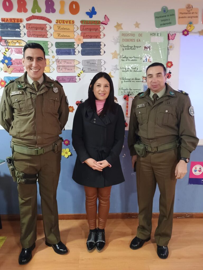 Acompañando a nuestros distinguidos invitados, estuvo presente nuestra Encargada de Convivencia Escolar, la Profesora Goretti Fariña Herrera, quien facilitó la interacción entre los alumnos y los destacados miembros de Carabineros de Chile.
