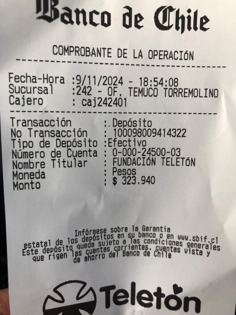 La suma fue depositada por nuestra directora, Sra. Eliana Rogel Almonacid, en las dependencias del Banco de Chile, llevando consigo el esfuerzo y cariño de cada uno de los integrantes de nuestra comunidad.
