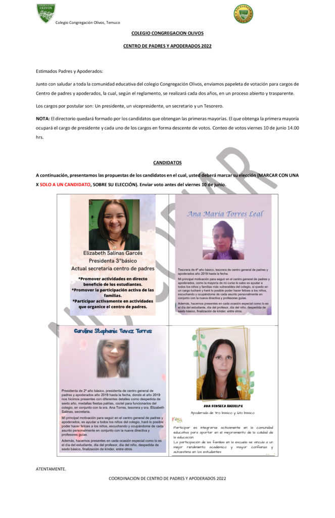 Compartimos los candidatos para participar en el centro general de padres y apoderados, por medio del documento que fue enviado a cada uno de los apoderados de nuestro establecimiento para que sean parte de esta importante decisión.