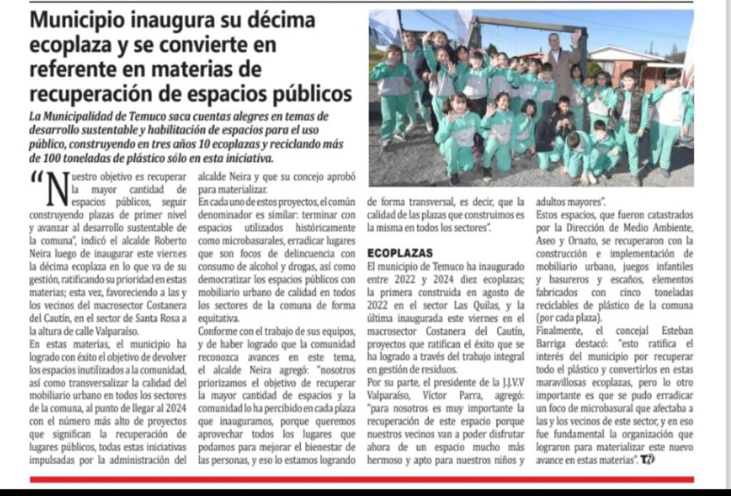 Nos complace anunciar que nuestro colegio, Congregación Olivos, ha sido honrado con una invitación de la Ilustre Municipalidad de Temuco para asistir a la inauguración de la nueva Eco Plaza en el sector Santa Rosa, cerca de la calle Valparaíso. Esta innovadora plaza ha sido construida utilizando materiales reciclados, destacando el compromiso de la comunidad con la sostenibilidad y el cuidado del medio ambiente.