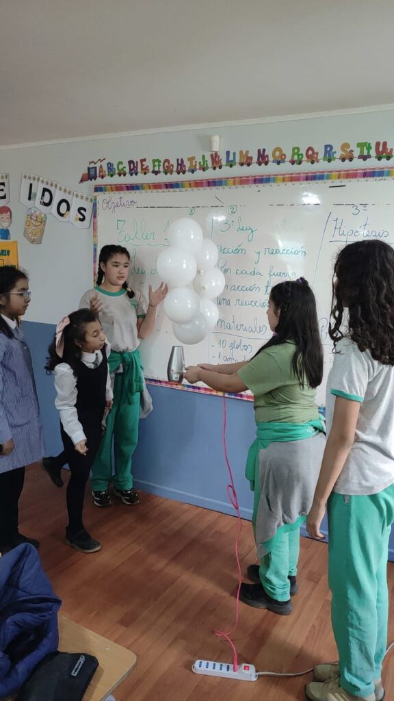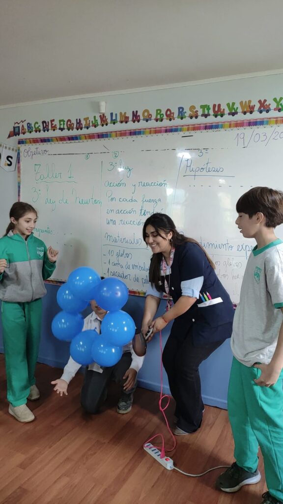 En esta oportunidad, los estudiantes realizaron un experimento práctico para comprender la Tercera Ley de Newton, que establece que toda acción genera una reacción de igual intensidad pero en dirección contraria.