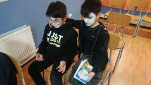 Estudiantes de 4°, 5° y 6° practican y realizan presentación de pantomimas (representación teatral en la que los actores no se expresan con palabras, sino únicamente con gestos) en concordancia con el taller de Teatro en el cual participan, está actividad potencia en los alumnos habilidades comunicativas y de lenguaje no verbal, además de trabajar desplante y seguridad para desenvolverse frente a grupos de pares.